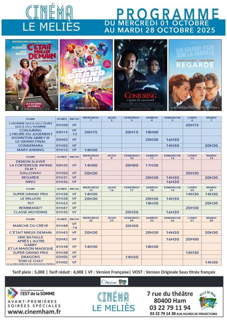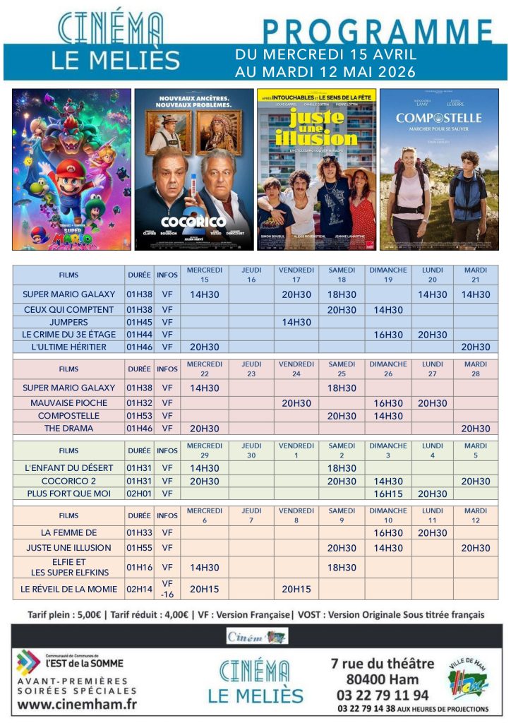 Retrouvez la programmation et informations pratiques sur le site internet dédié au cinéma de Ham : www.cinemham.fr