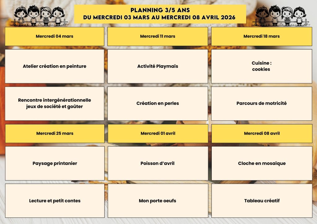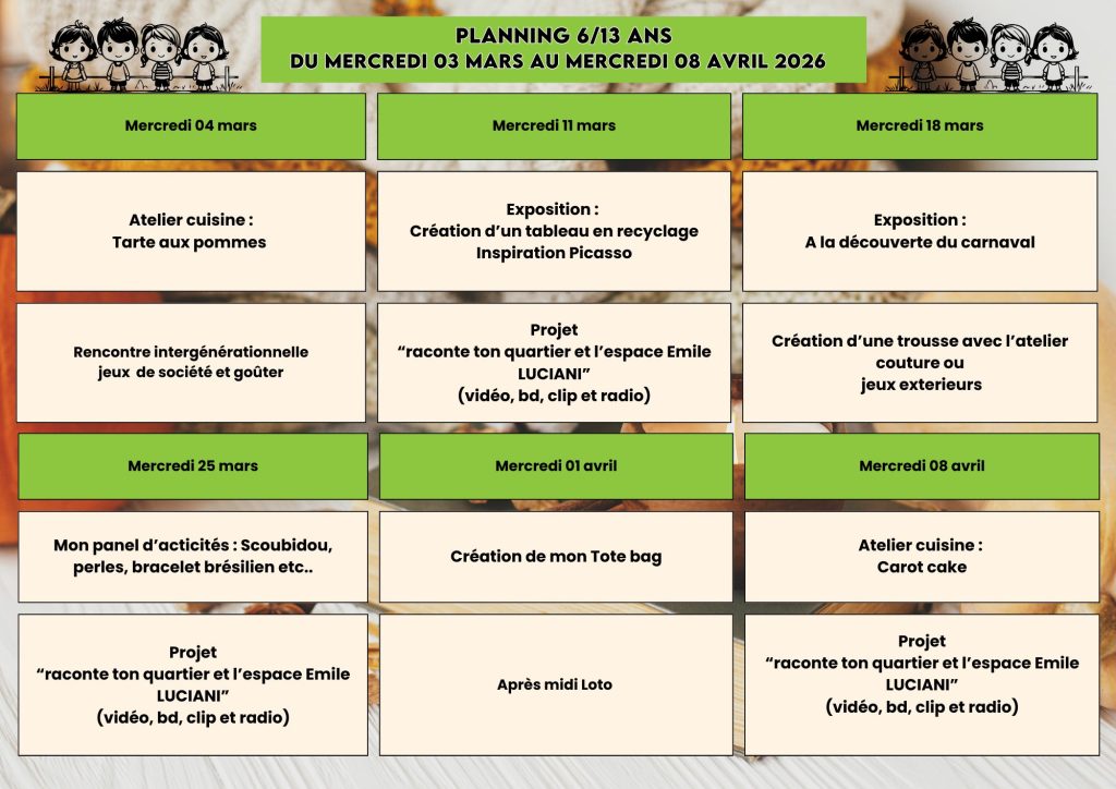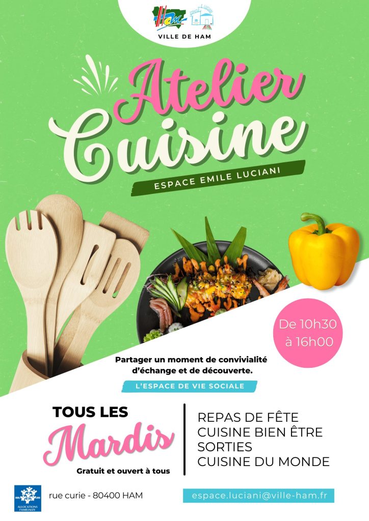 Mardi : 10h30–15h30, atelier cuisine, découverte des recettes du monde, préparation de plats traditionnels, dégustations collectives, développement des compétences culinaires et ouverture à la diversité culturelle, 14h00–17h00, atelier jeux de société tout âge, favorisant le lien intergénérationnel.