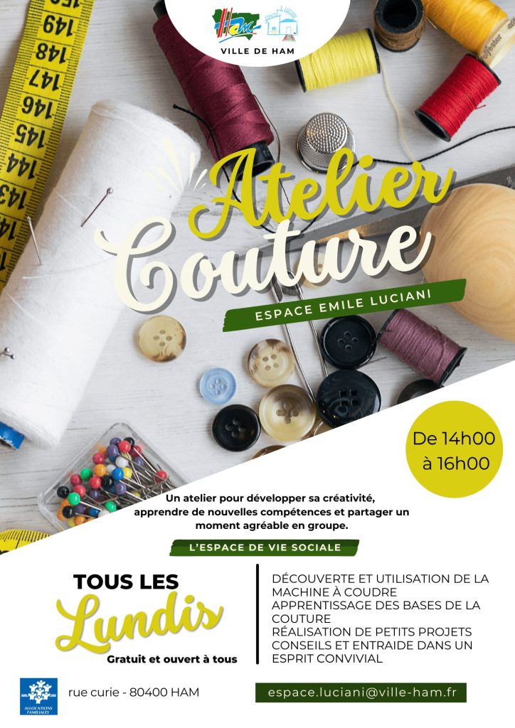 Lundi : 10h00–12h00, atelier couture, 10h30–12h00, UFOLEP, ateliers sport et bien-être pour les +50 ans, adaptés aux personnes avec pathologies ou en reprise d’activité physique, séances douces de gymnastique, renforcement musculaire et activités ludiques, 14h00–17h00, atelier jeux de société, développement de la stratégie, de la logique et du lien social.