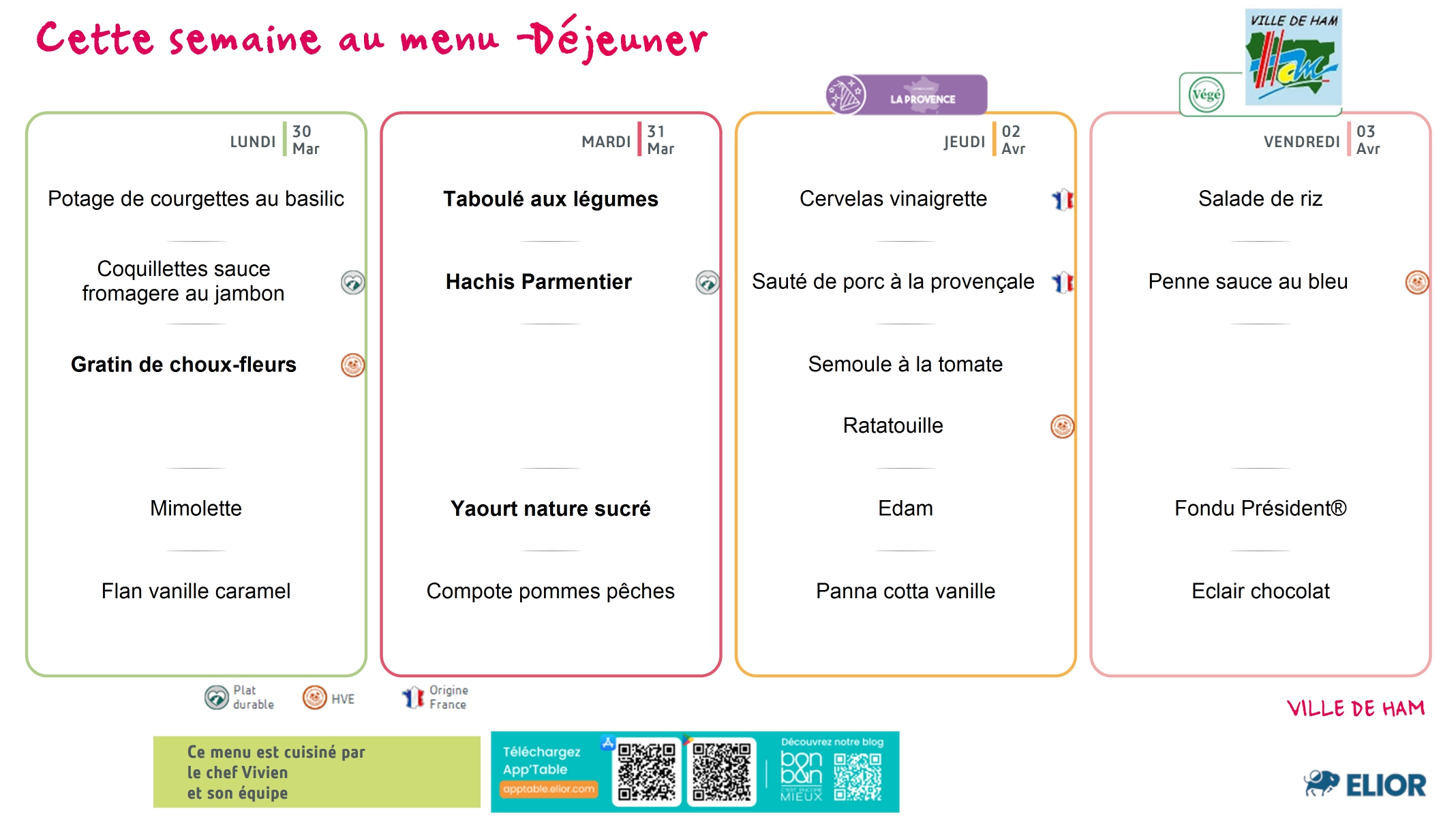 Ville de Ham > L’actualité > ACTUALITE > Menus restauration scolaire – du 30 Mars au 3 Avril 2026